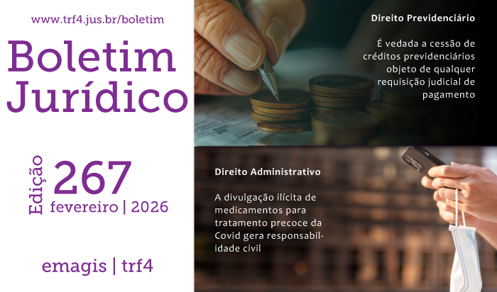 Blog Blog Destaques Direção do Foro recebe desembargador federal aposentado Antônio Albino Ramos de Oliveira (12/02/2026) • fevereiro 12, 2026 Quatro servidores do Mapa e três administradores de uma indústria de laticínios são condenados por corrupção (11/02/2026) • fevereiro 12, 2026 JFPR sedia reunião para alinhar estratégias de formação em IA na 4ª Região (10/02/2026) • fevereiro 11, 2026 A edição nº 267 do Boletim Jurídico do TRF4 já está disponível (11/02/2026) • fevereiro 11, 2026 Homem é condenado por comércio ilegal de armas e, junto com outro réu, também por falsidade ideológica e comunicação falsa de crime (11/02/2026) • fevereiro 11, 2026 JFPR abre inscrições para seleção de projetos sociais de entidades públicas e privadas (10/02/2026) • fevereiro 10, 2026 TRF4 está com inscrições abertas para estágio em Biblioteconomia até o dia 20 de fevereiro (09/02/2026) • fevereiro 9, 2026 Incra deverá concluir, em 180 dias, processo de titulação de lote ocupado por um assentado do PA Rondinha (06/02/2026) • fevereiro 6, 2026 Direção do Foro recebe desembargador federal aposentado Antônio Albino Ramos de Oliveira (12/02/2026) • fevereiro 12, 2026 Quatro servidores do Mapa e três administradores de uma indústria de laticínios são condenados por corrupção (11/02/2026) • fevereiro 12, 2026 JFPR sedia reunião para alinhar estratégias de formação em IA na 4ª Região (10/02/2026) • fevereiro 11, 2026 A edição nº 267 do Boletim Jurídico do TRF4 já está disponível (11/02/2026) • fevereiro 11, 2026 Homem é condenado por comércio ilegal de armas e, junto com outro réu, também por falsidade ideológica e comunicação falsa de crime (11/02/2026) • fevereiro 11, 2026 JFPR abre inscrições para seleção de projetos sociais de entidades públicas e privadas (10/02/2026) • fevereiro 10, 2026 TRF4 está com inscrições abertas para estágio em Biblioteconomia até o dia 20 de fevereiro (09/02/2026) • fevereiro 9, 2026 Incra deverá concluir, em 180 dias, processo de titulação de lote ocupado por um assentado do PA Rondinha (06/02/2026) • fevereiro 6, 2026